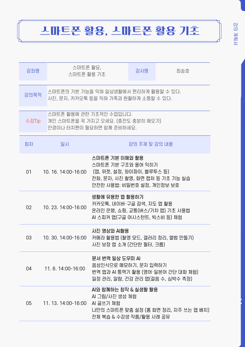 기초부터 차근차근 배우며, 스마트폰의 기본 기능과 일상에서 활용 가능한 AI 기능까지 익힐 수 있는 수업입니다.