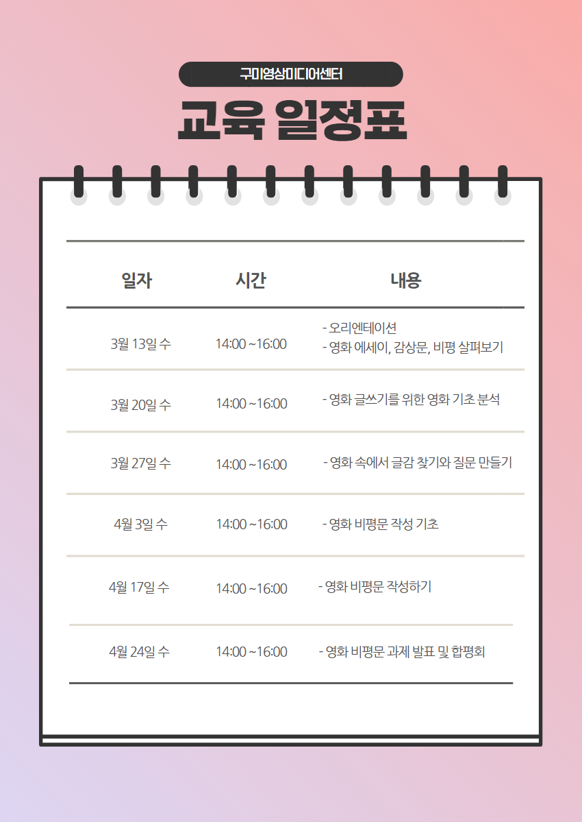 일상에서 영화로 글을 써 내려가기 위한 기초 수업입니다.영화를 보고 어떤 글을 무엇으로 작성하면 좋을지 막막한 분들과 함께영화 분석부터 시작하여 매주 피드백을 통해 나만의 비평문을 완성합니다.수업 후 제작될 구미영상미디어센터 문집에 내 글을 실어보세요.커리큘럼