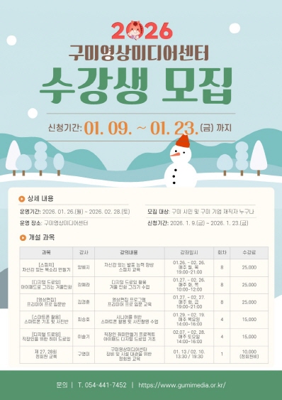 • 구미영상미디어센터는 공공미디어 서비스 제공 기관으로 수요자 중심 맞춤형 미디어교육과 창작지원 활동을 통해 시민 누구나 영상 크리에이터가 될 수 있는 환경을 조성하고, 미디어 리터러시와 디지털 미디어 활용능력 향상으로 능독적이고 창의적인 영상미디어 문화도시 구미 만들기에 앞장서겠습니다.