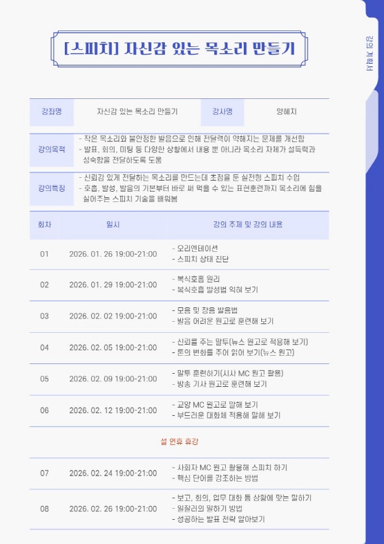 신뢰감 있게 전달되는 목소리를 만드는 데 초점을 둔 실전형 스피치 수업입니다.