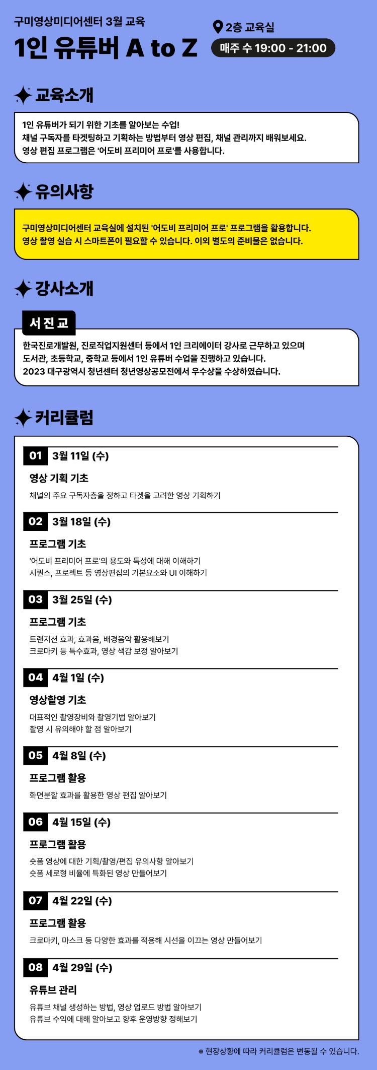 - 2026-03-11 ~ 2026-04-29 매주 수요일 19:00 - 21:00