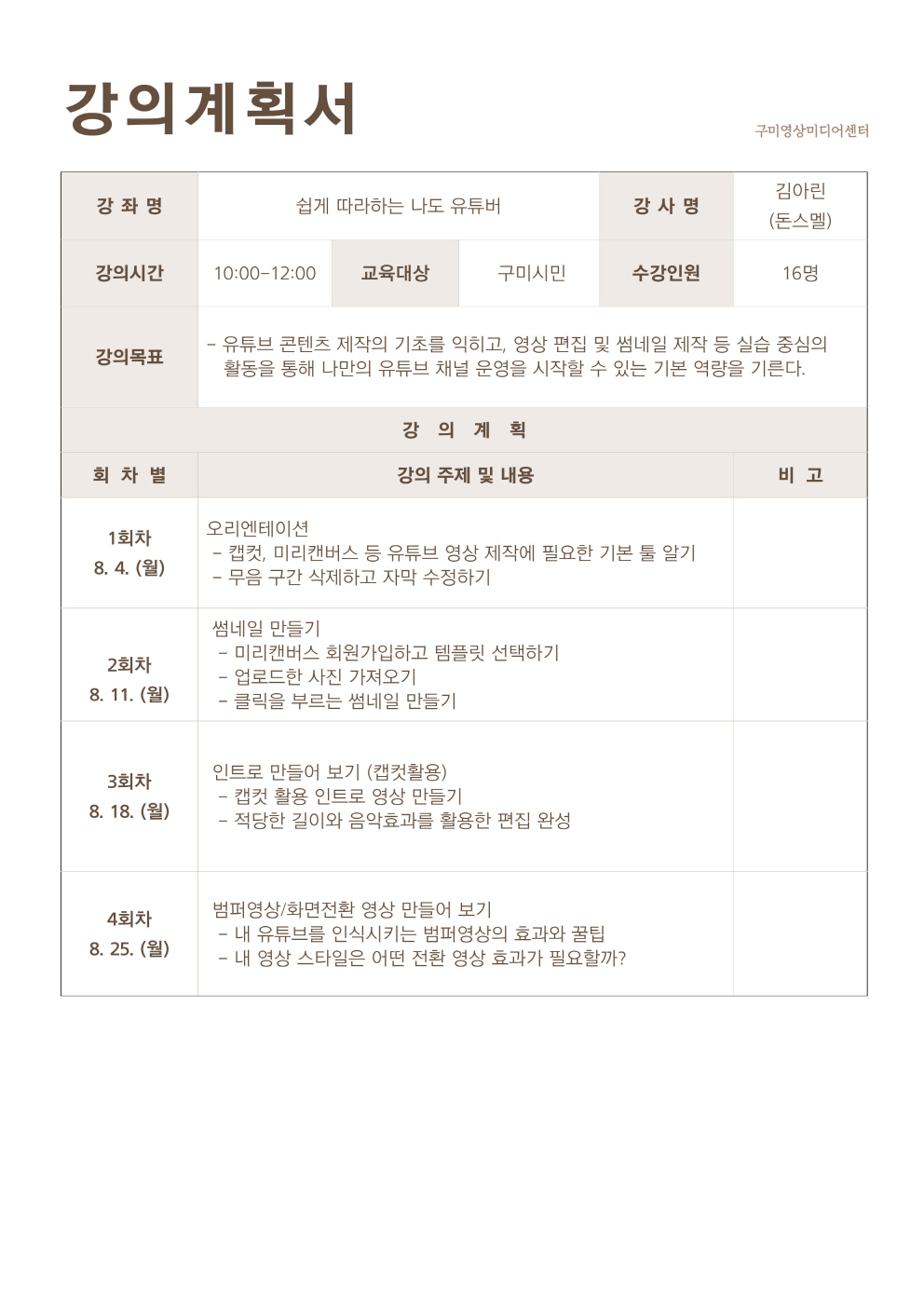 - 2025-08-04 ~ 2025-08-25 매주 월요일 10:00~12:00